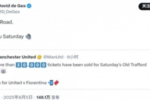 德赫亚将北京时间8月9日19点45分随佛罗伦萨重返红魔主场,与旧主进行一场友谊赛,他在2011年到2023年效力于曼联,出场545次,丢590球零封190次。