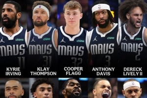 图中球员包括:凯里-欧文、克莱-汤普森、库珀-弗拉格、安东尼-戴维斯、德里克-莱夫利二世、德安吉洛-拉塞尔、马克斯-克里斯蒂、纳吉-马绍尔、PJ-华盛顿和丹尼尔-加福德。