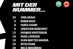 法兰克福首发:33-格拉尔、4-科赫、8-查伊比、9-布尔卡特、13-拉斯穆斯-克里斯滕森、16-雨果-拉尔森、19-巴霍亚、20-堂安律、29-恩库恩库、34-纳姆迪-科林斯、42-乌尊