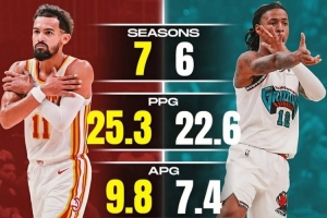 特雷-杨(7个赛季):场均25.3分3.5篮板9.8助攻1抢断;出战27场季后赛,场均26.4分3.4篮板9助攻1.7抢断