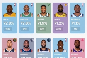 奥尼尔,篮下命中率72.8%,篮下出手1529次;