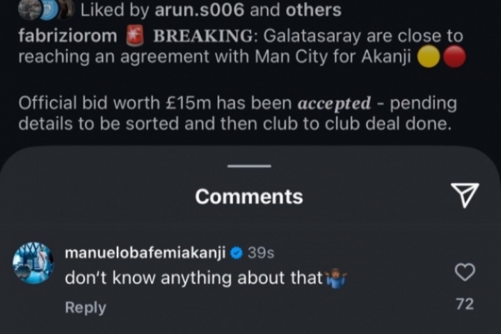 阿坎吉出现在罗马诺的ins评论区,他评论道:我什么都不知道。