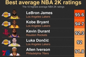 体育资讯8月23日讯 今日美媒HoopsHype晒出NBA球员2K历史平均评分最高的10位球员,具体如下: