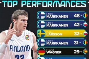 热身赛单场得分榜Top10如上图,马尔卡宁独占三席,详情如下: