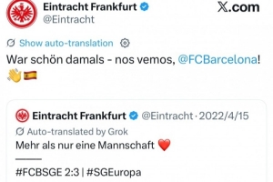 在抽签出炉后,法兰克福官推转发了22年4月,球队在欧联杯1/4决赛次回合客场3-2击败巴萨晋级下一轮的赛后球队合影庆祝胜利的社媒,并配文写道:“那是一段美妙的经历,期待我们的再次相见,巴萨!”