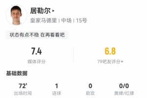体育资讯8月31日讯 西甲第三轮,皇马暂2-1领先马洛卡。此役居勒尔首发72分钟被换下,球员全场重点数据如下↓