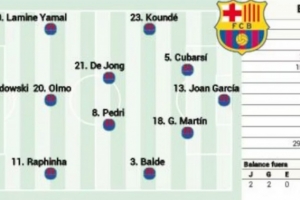 体育资讯8月31日讯 北京时间周一凌晨的西甲第3轮比赛,巴萨将前往客场挑战巴列卡诺。《阿斯报》对本场比赛首发阵容进行了预测,库巴西和杰拉德-马丁搭档中卫,莱万、亚马尔和拉菲尼亚组成进攻三叉戟,加维缺阵。