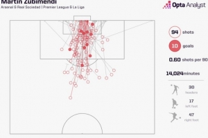 据统计,这是苏维门迪在顶级联赛生涯首次打进禁区外的远射,他在为皇家社会和阿森纳效力的比赛中94次射门打进10球,但是首次打进远射。