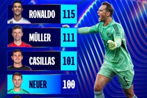 目前,诺伊尔在欧冠已经收获100场胜利,成为第四名做到这一点的球员,在他身前是C罗(115胜)、托马斯-穆勒(111胜)和卡西利亚斯(101胜)。
