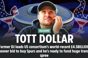 创纪录!太阳报:美国财团想33亿镑买热刺,再花12亿镑用于转会等