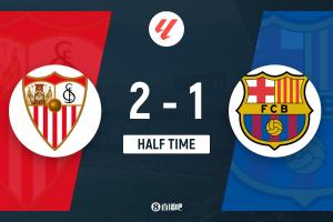 上半场伤停补时6分钟,半场结束,巴萨暂1-2塞维利亚。