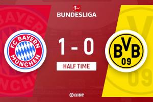 半场-拜仁暂1-0多特 凯恩头球破门+7轮12球基米希角球助攻