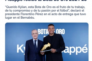 在这里,你正穿着你如此渴望的白色球衣,书写着你自己的历史。我们的球迷崇拜你,并将在每一次挑战中陪伴你。亲爱的姆巴佩,这座金靴奖对你来说是继续赢下去、继续为皇家马德里的伟大历史做出贡献的又一动力。